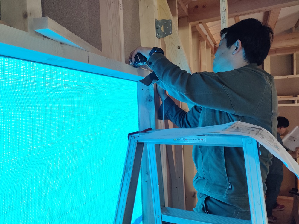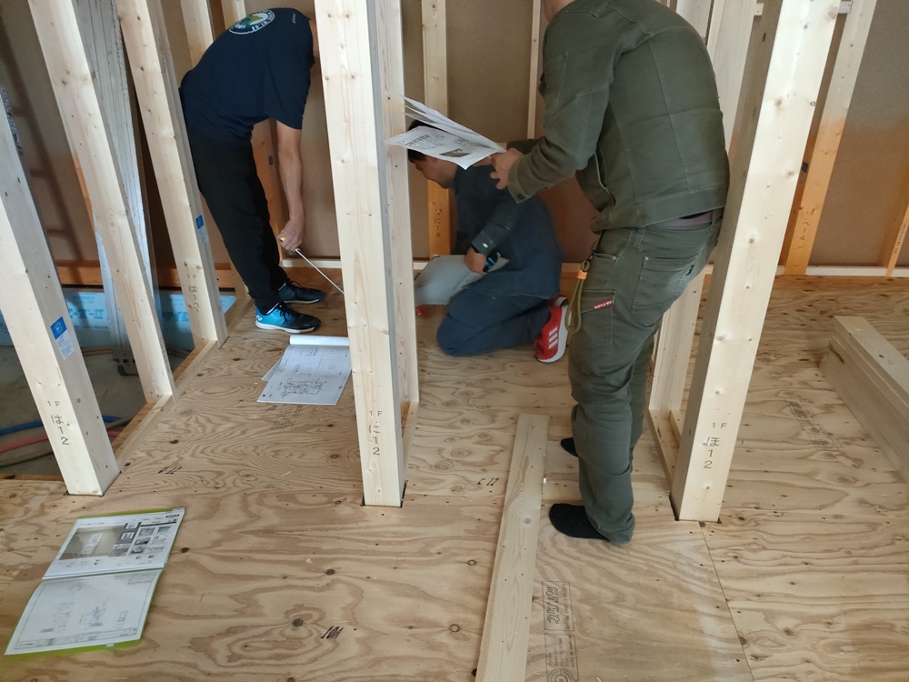 弊社は吹付断熱を標準としているため、特に吹付面に影響する部材の位置決定はとても重要なステップの一つとなります。