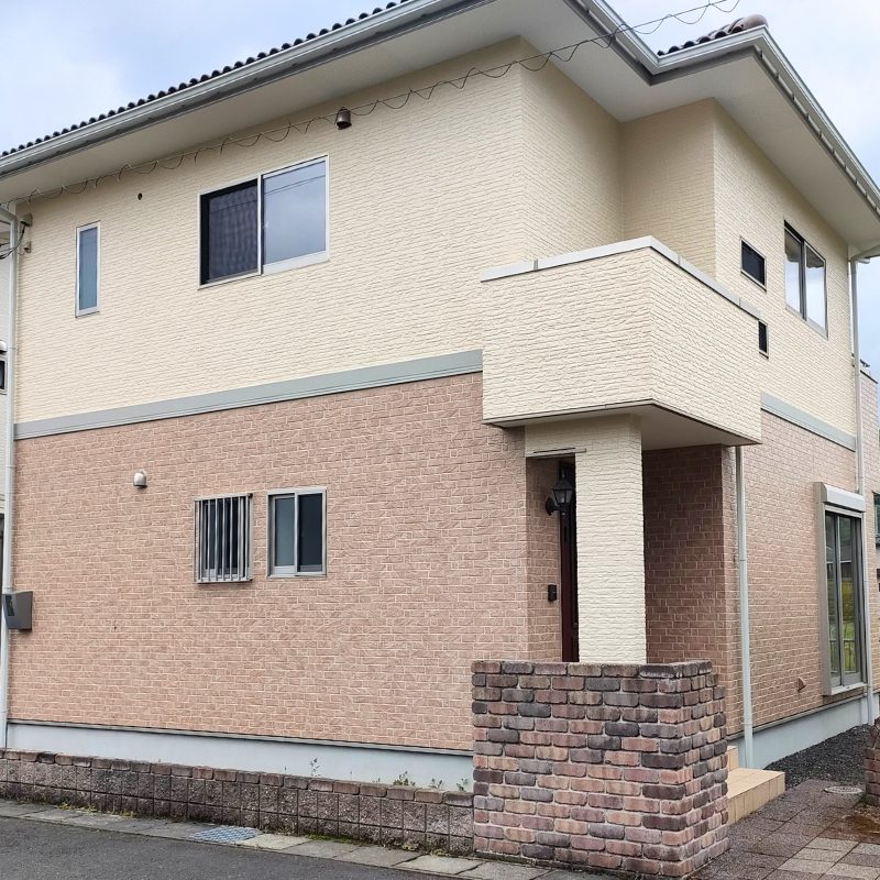 2階と玄関のクリーム色の部分は色付けしていますが、1階のレンガ調の部分は洗浄だけで色付けなしのクリア塗装です。