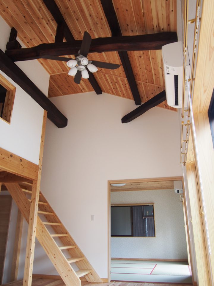 →1.平屋である屋根裏の空間を活かして、リビング上部を吹き抜けにして梁を見せ屋根裏に息子さんの