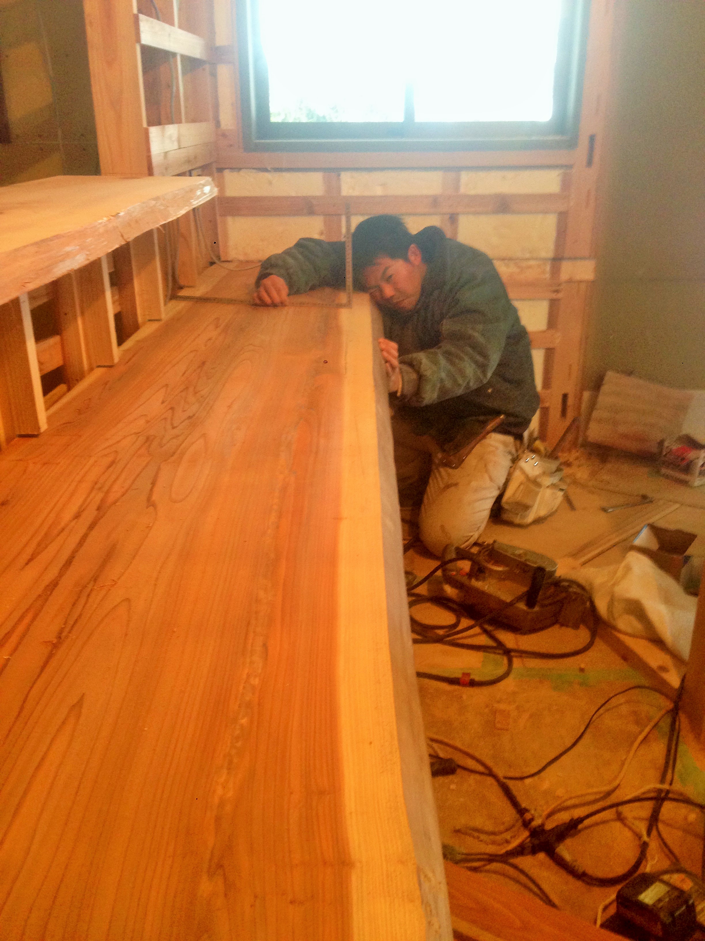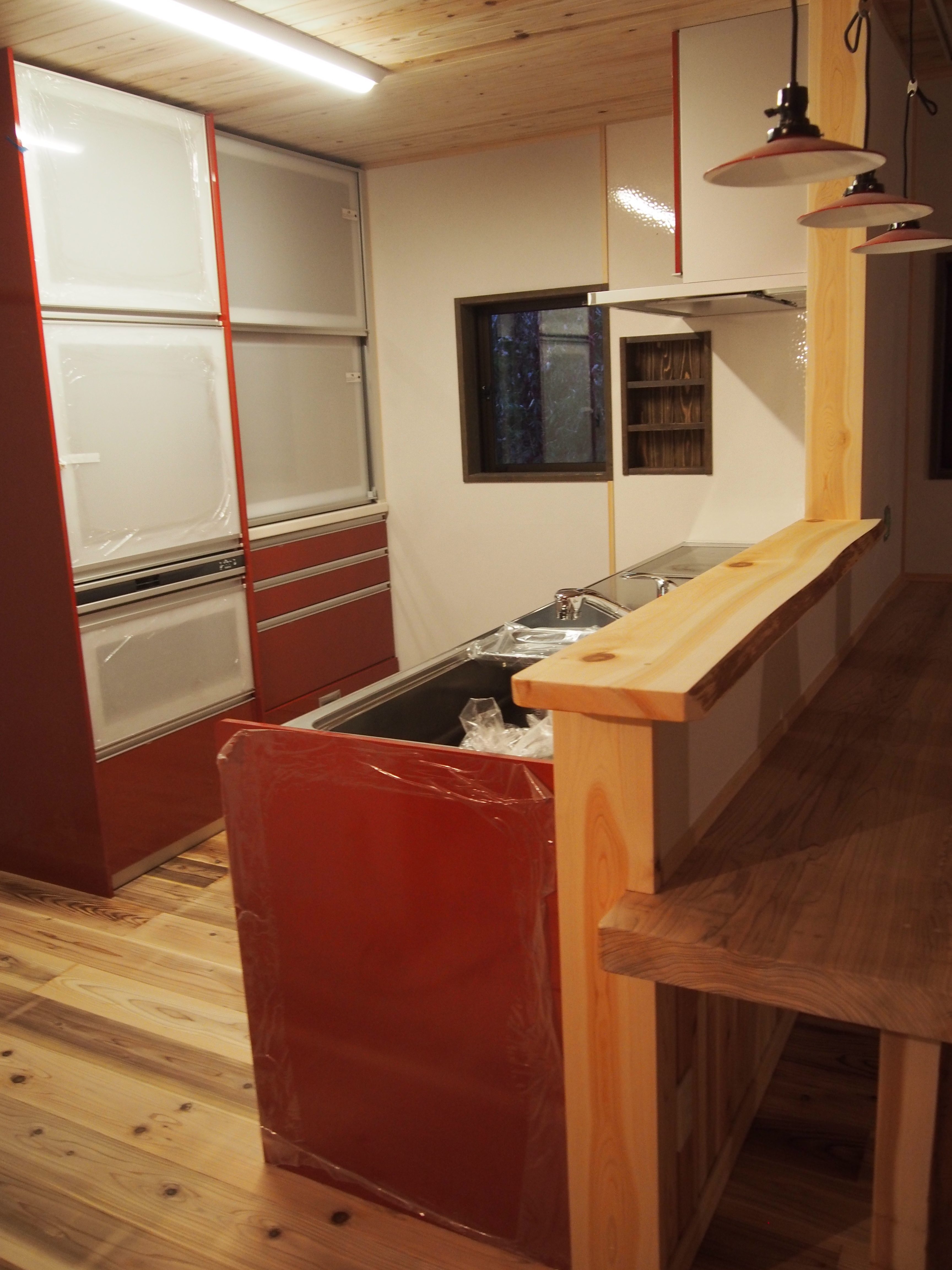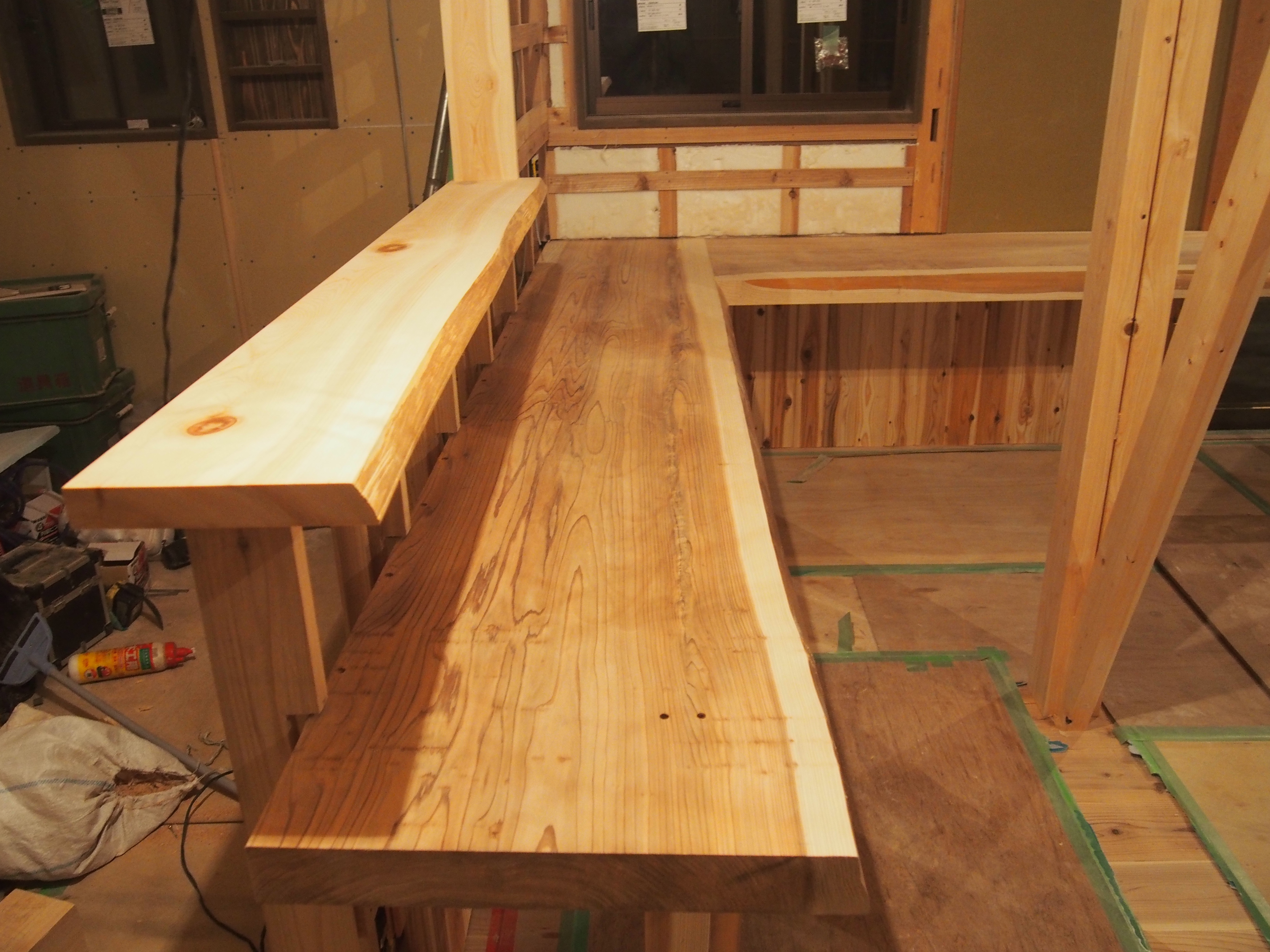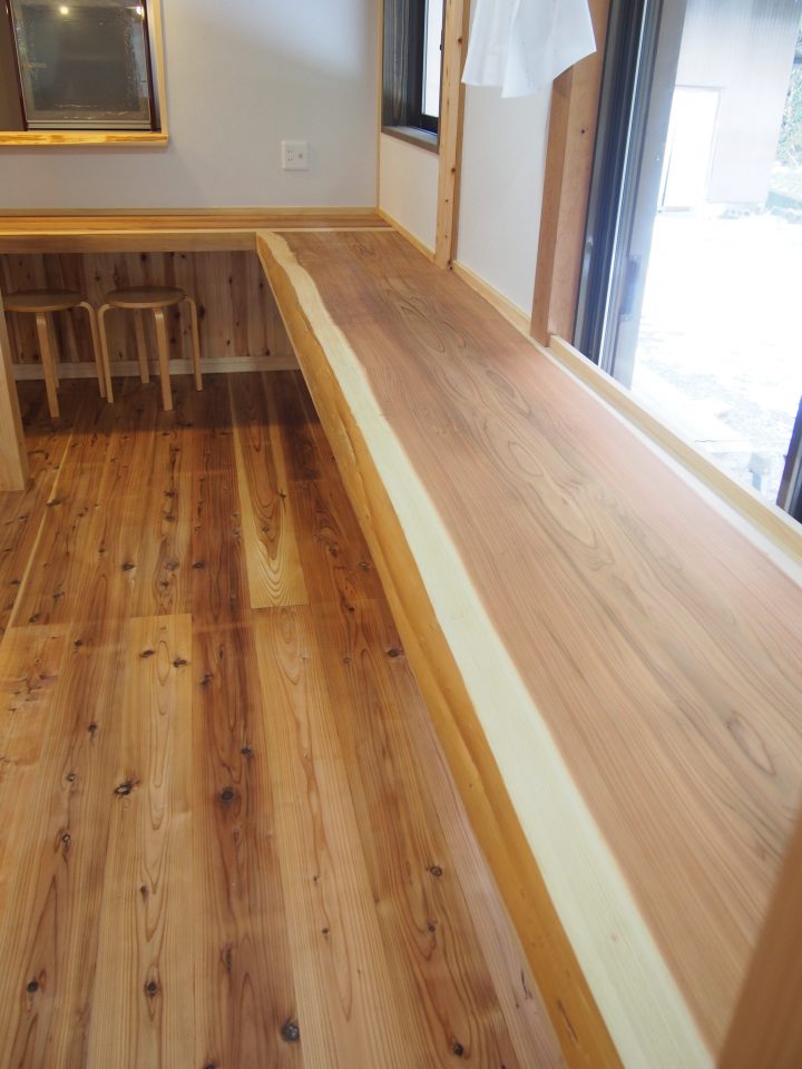 ・対面キッチンのカウンターには3mと4mの一枚板をL型に…。