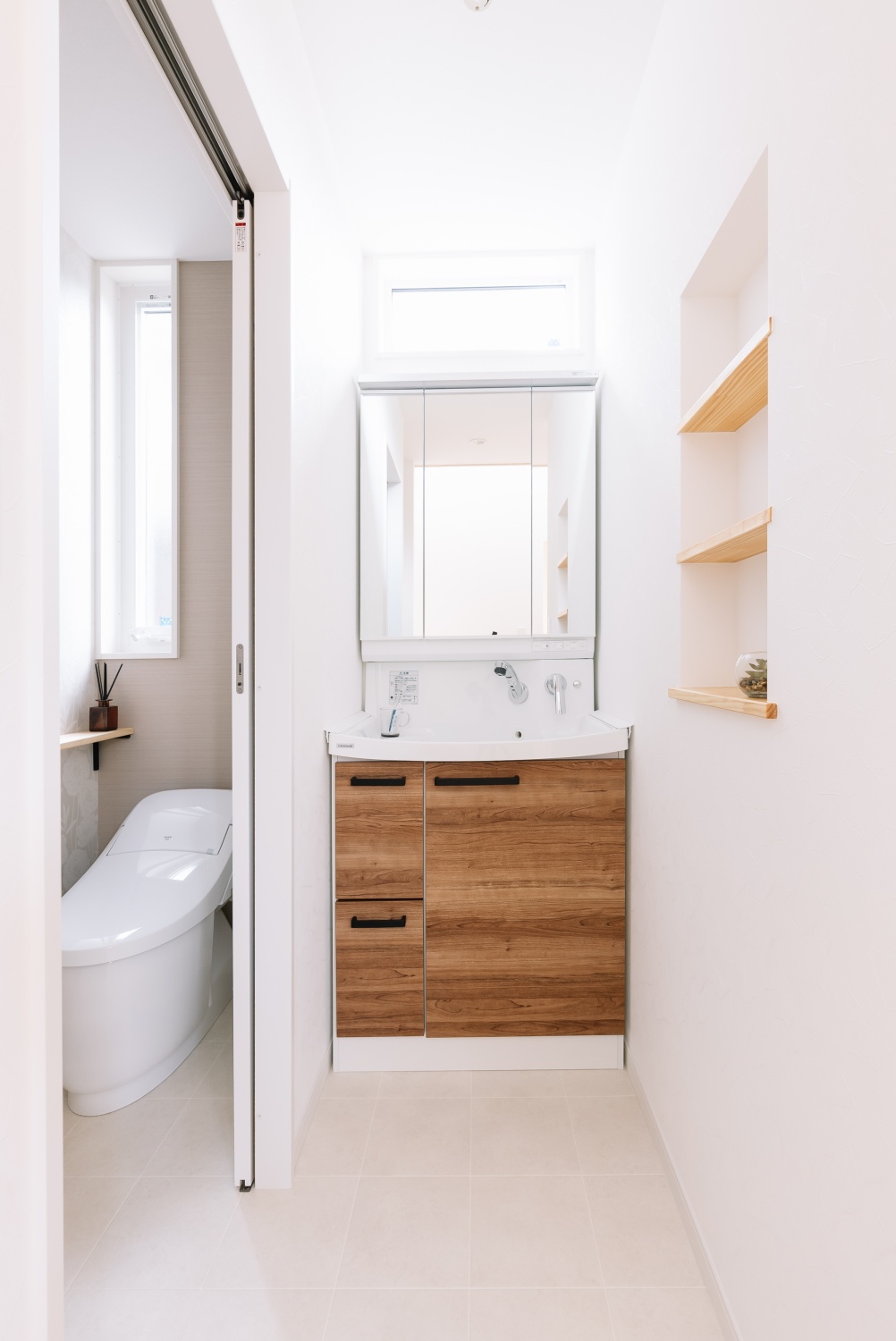 脱衣室と洗面室を分けることで、家族が入浴中でも気を使わずに洗面を利用できます。