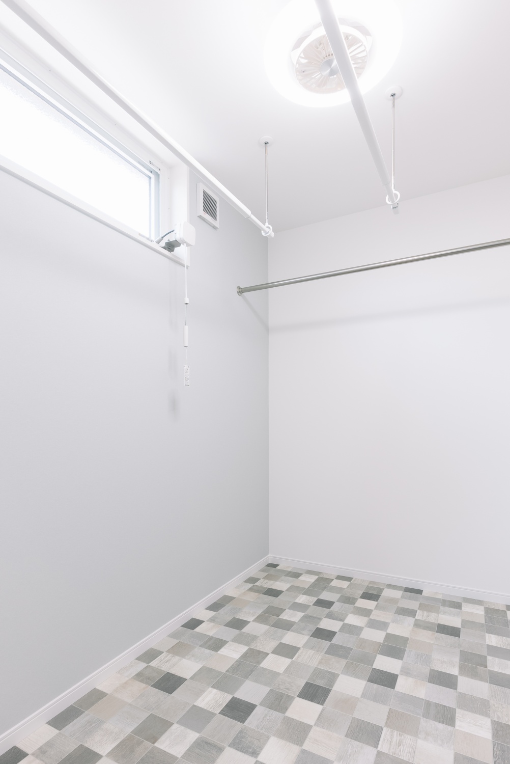 広いランドリースペースにはファン付きの照明でしっかり乾燥!