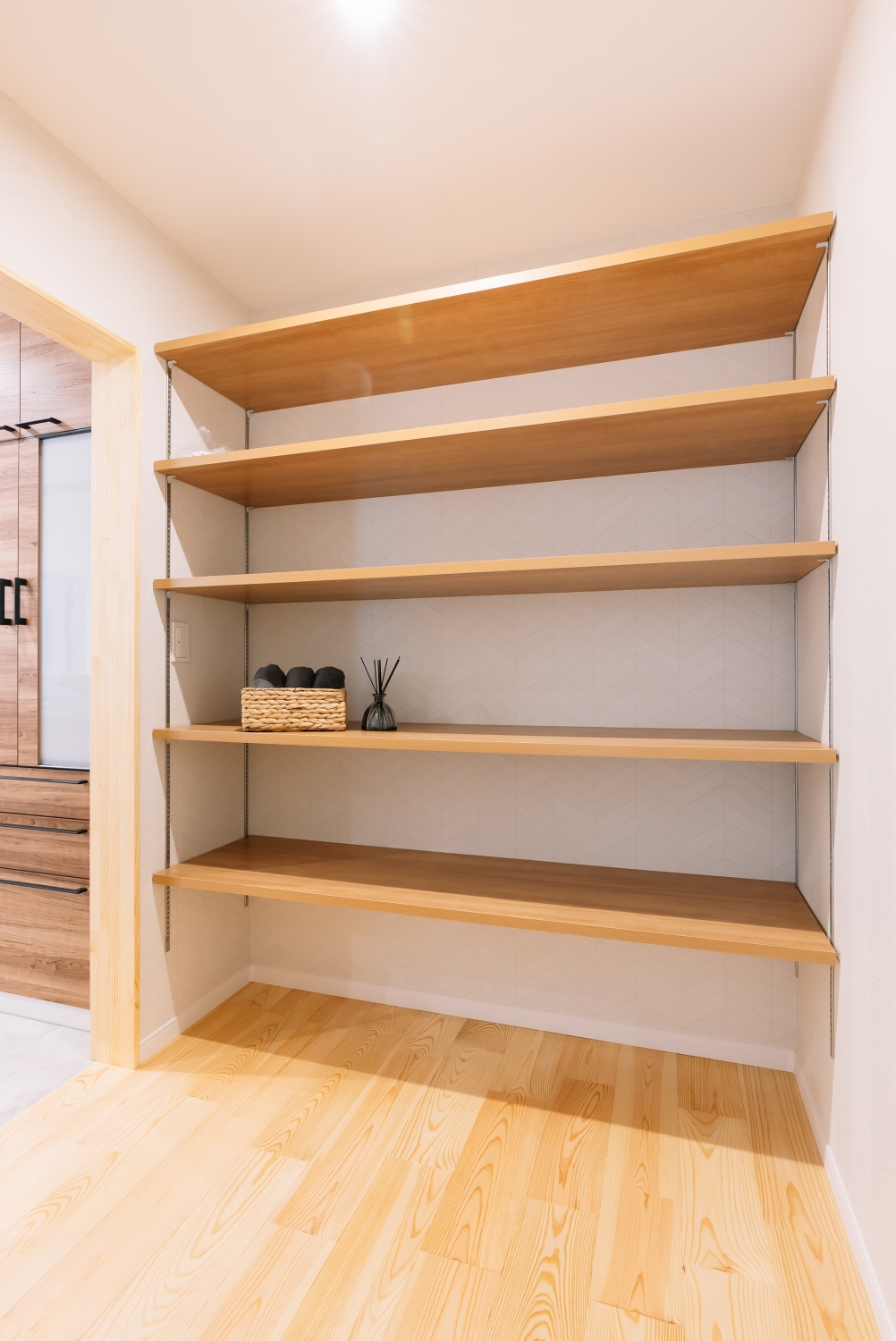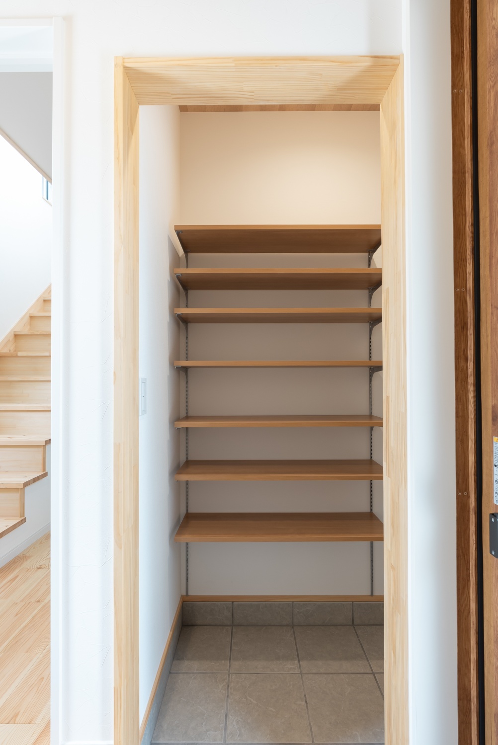 玄関からパントリーを通りそのままキッチンへ直行できる動線や、キッチン横に設置されたパントリーによりお料理しながらスムーズに物も取りやすく日々の暮らしをより楽ちんに。