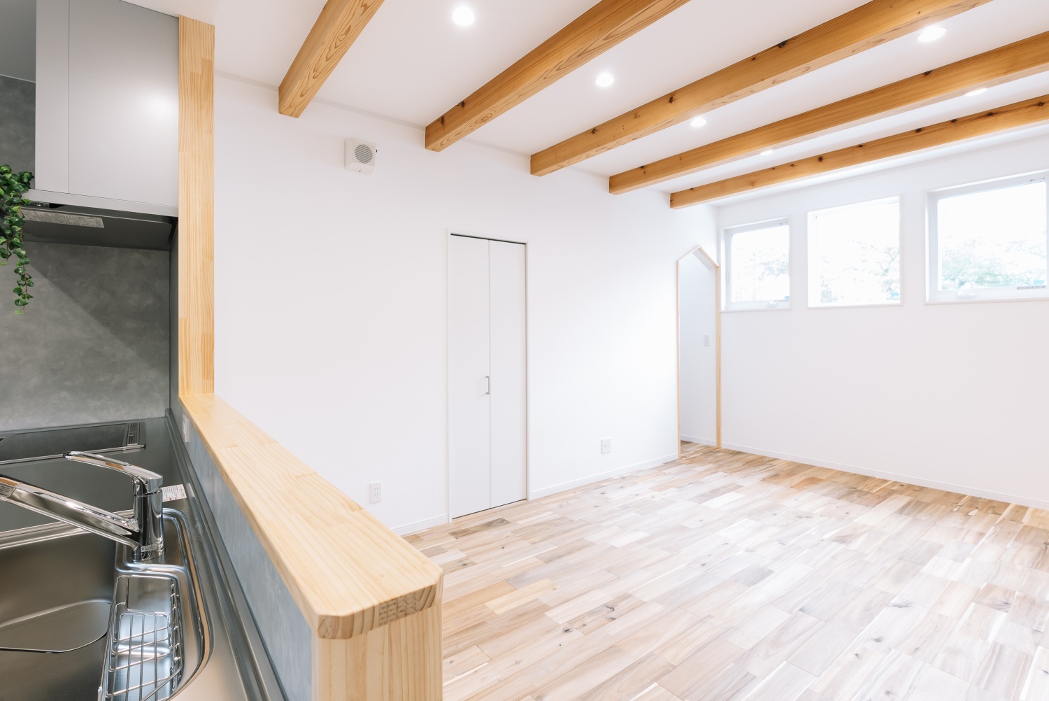 リビング・ダイニング・キッチンは南向きの窓からの明るい光が差し込み、家族がほっと一息つける場所です。収納スペースも充実しており、日常の物を整理整頓できます。