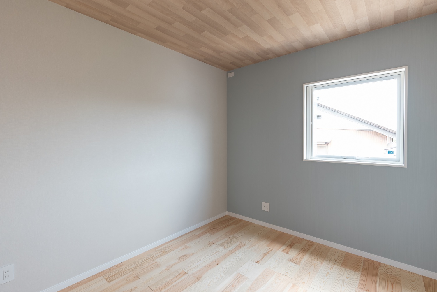 無垢床とくすみカラーの壁紙で優しさあふれる空間に