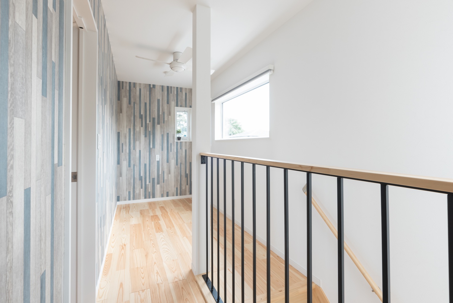 2階フリースペースは、壁紙とアイアンとシーリングファンの、ライトなインダストリアルテイストでまとめる