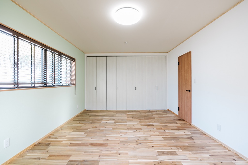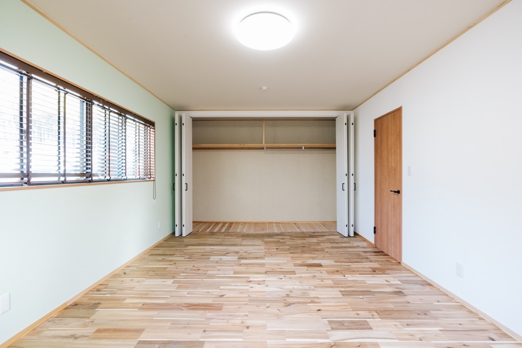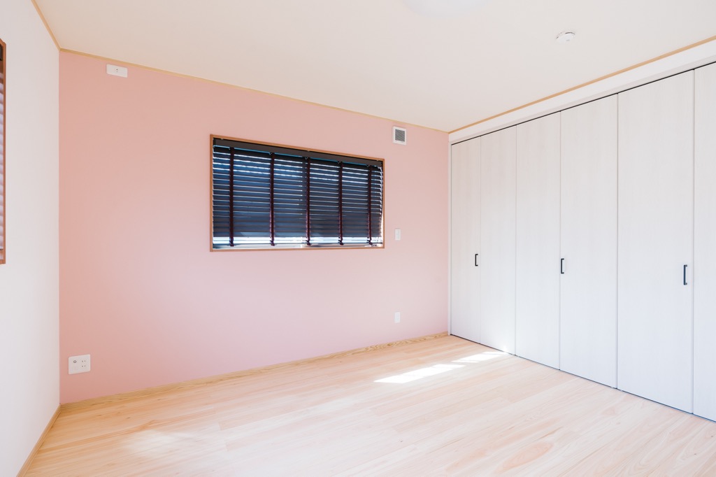 正面がピンクの塗り壁がかわいいキッズルーム。たっぷり収納できるクローゼットを配置