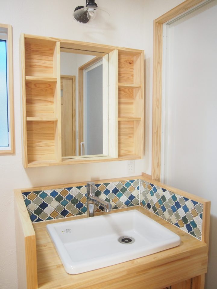 洗面化粧台はオーダーで制作。おしゃれなタイルがポイント