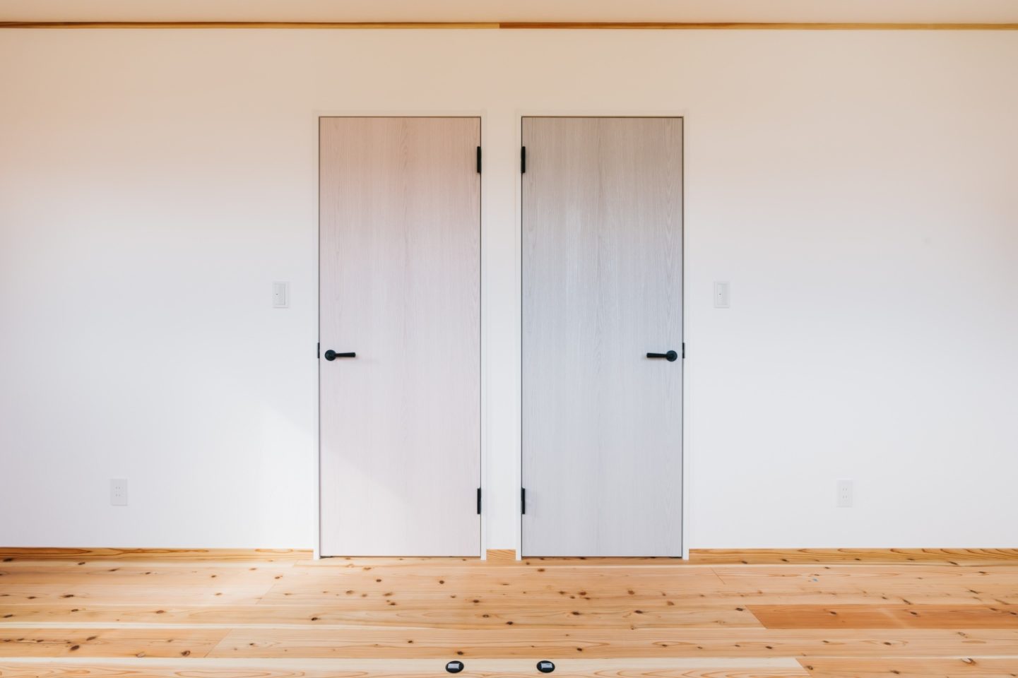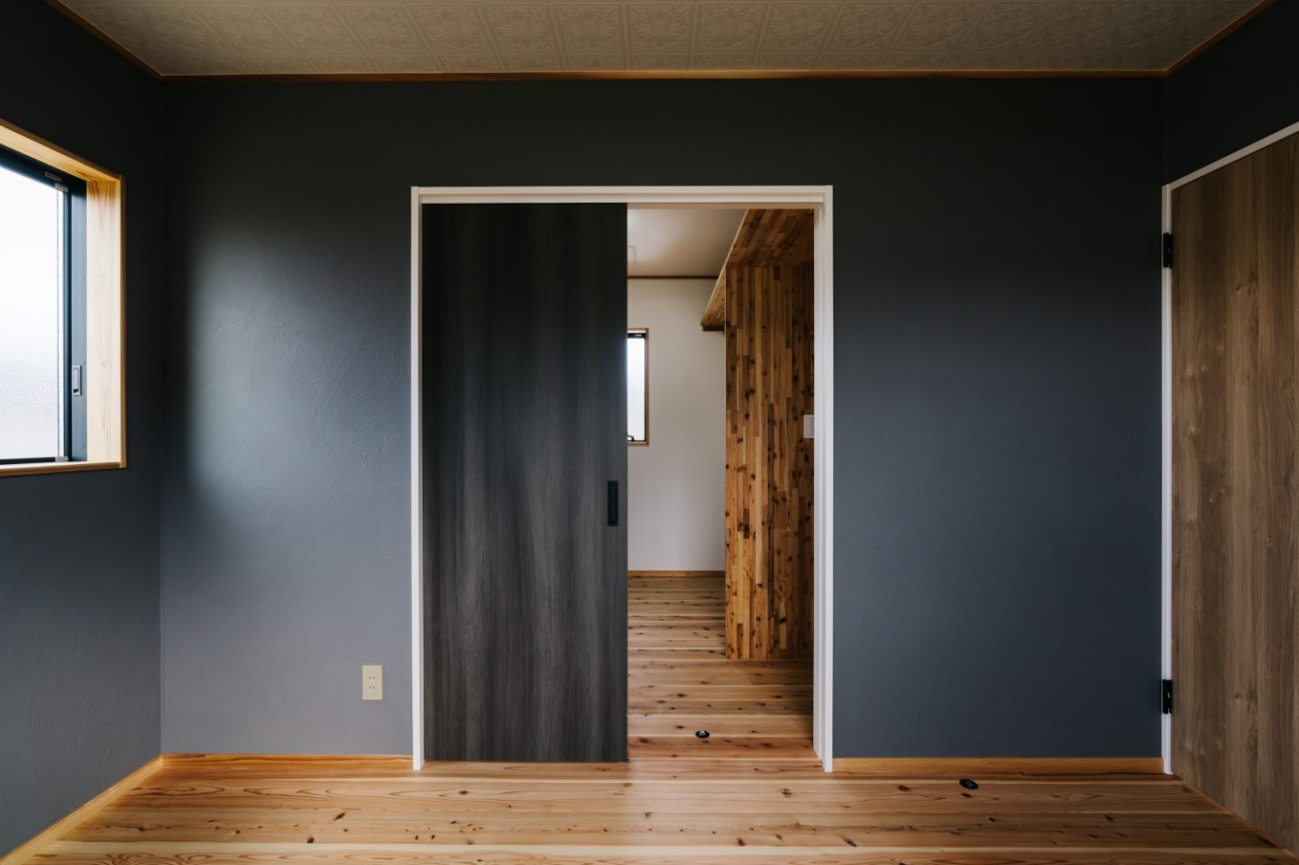 ダークカラーでも無垢の床板で重くなりすぎず落ち着きのある寝室