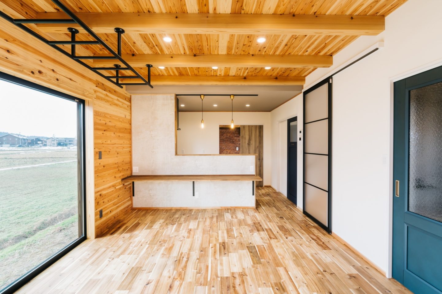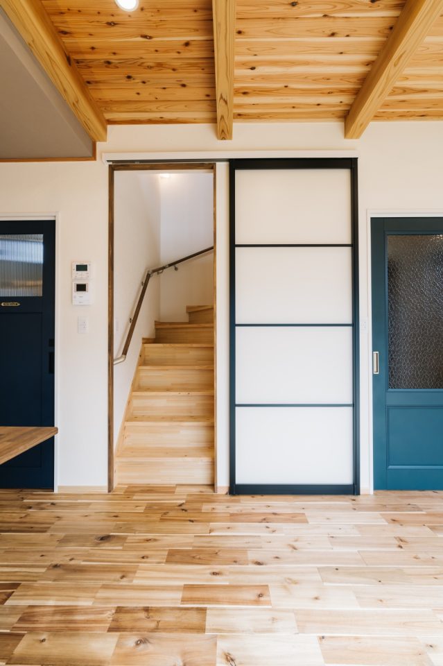 気取りすぎない男前空間。玄関収納はアイアンのレールが目を惹くバーンドア。リビングはブルーやネイビー系をメインにしたカラーセレクト。パントリーはレンガ調のアクセントクロスを使用しました。無垢のフローリングに梁見せ天井と木の温かみもプラスされ、男女問わず心地よく過ごせるシンプルでメンズライクな空間に。造り付けのカウンターデスクがご夫婦のパソコンスペースやお子様の勉強スペースになり、お子様を見守ることができます。アイアンのうんていを設置し、家族が集まるリビングダイニングとなりました