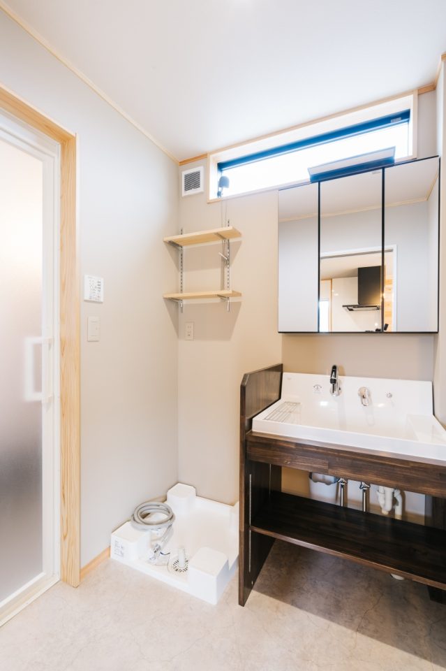 ミラーキャビネットや可動棚を配置し収納計画。