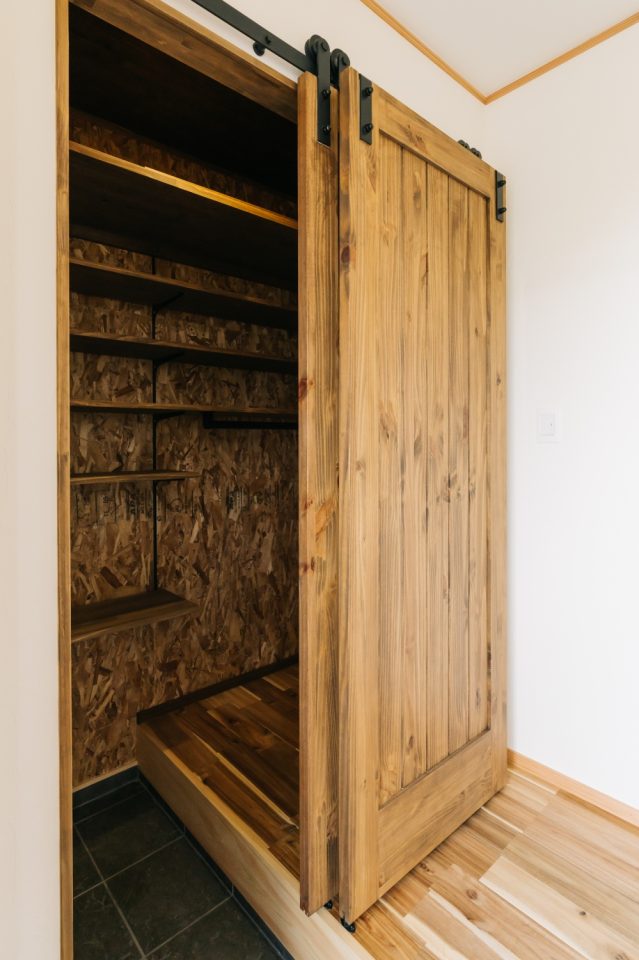 玄関収納はアイアンのレールが目を惹くバーンドア。土間からも室内からも荷物を出し入れできる仕組み