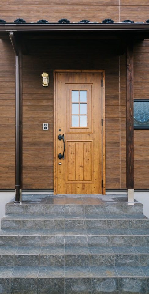 木目調の玄関ドアとマリンブラケットライトがマッチ